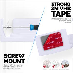 لا يتطلب خيار التثبيت السريع الخاص به أي براغي أو أدوات. نحن نستخدم فقط أفضل شريط 3M VHB لتركيب الأرفف على مجموعة متنوعة من الأسطح. ما عليك سوى نزع الغطاء الأحمر من شريط 3M VHB والصقه في المكان المطلوب ، واتركه لساعات قليلة وستكون جاهزًا للانطلاق. لا تضعه على الجدران المطلية أو المعتمة أو الجصية ، فهذه الأسطح ليست مناسبة للتركيب اللاصق!