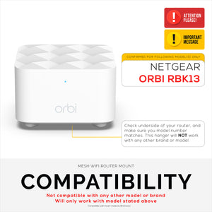تم تصميم حامل الحائط الخاص بنا بحيث لا يعيق إشارة WiFi الخاصة بجهاز Netgear Orbi RBK13. غير متوافق مع أي طرازات أخرى من Netgear.